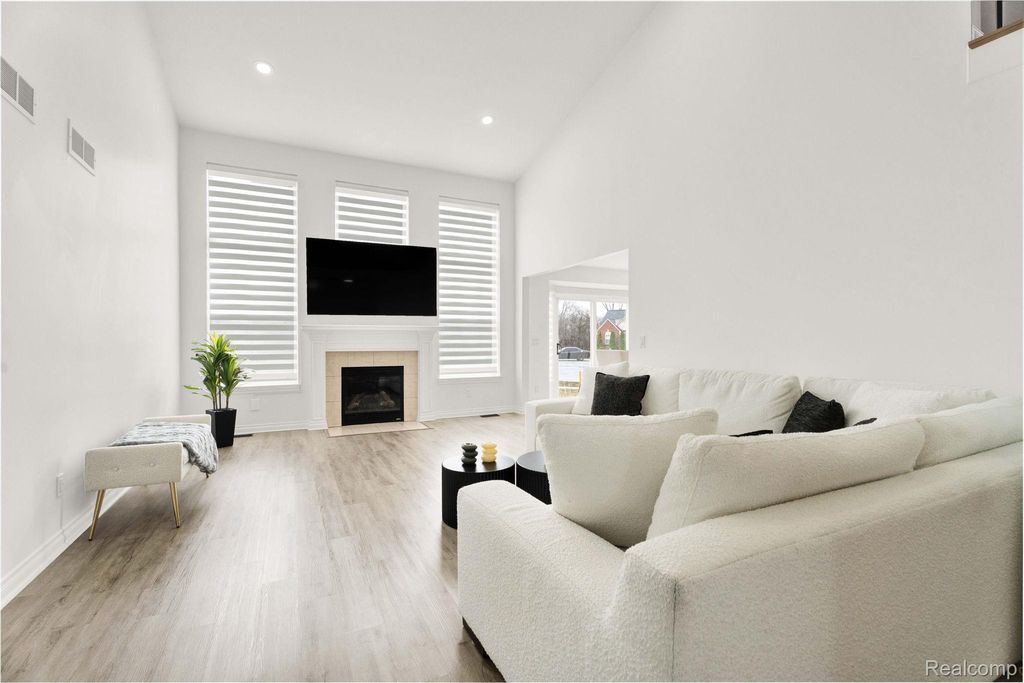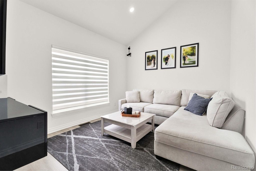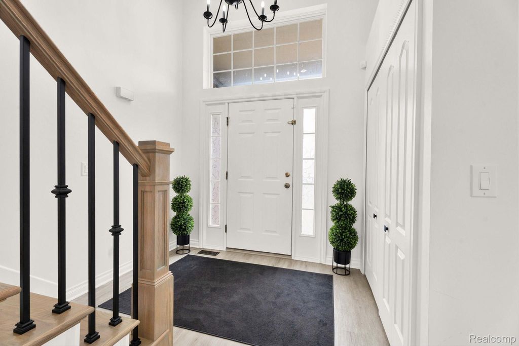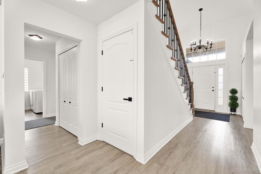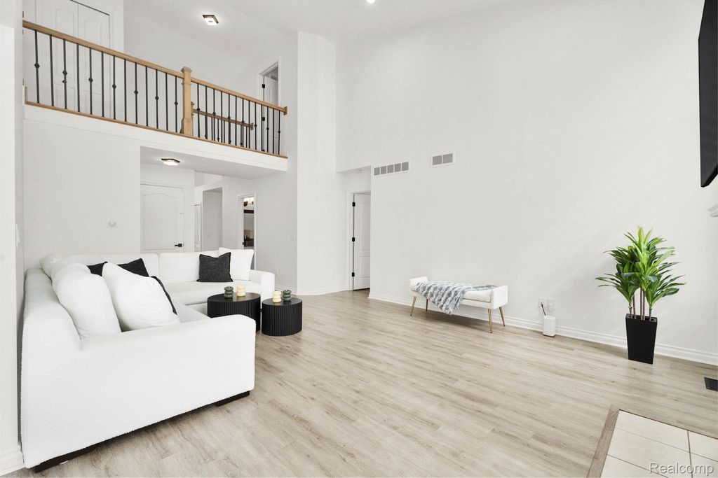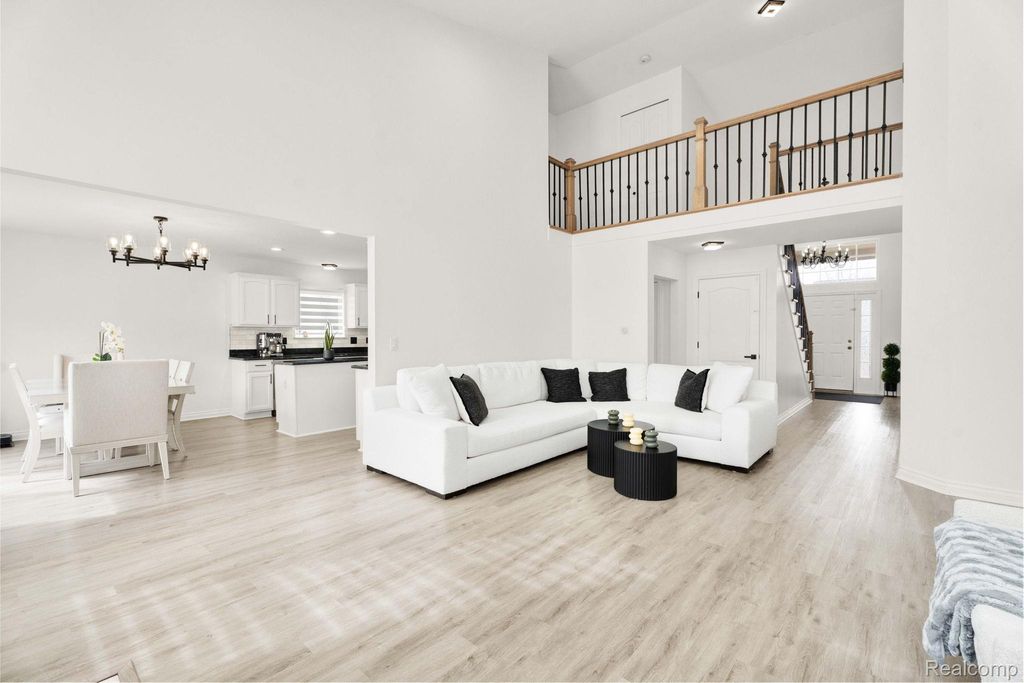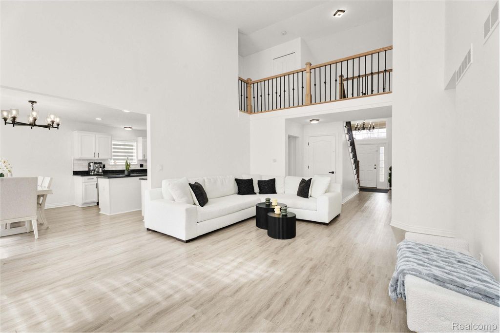 Stunning updated split-level home offering 4 bedrooms, including a first-floor primary suite, and an open floor plan. A welcoming entry leads directly into a large great/family room with vaulted ceilings, an upper-level overlook, and abundant natural light, showcasing a beautiful staircase with hardwood steps.