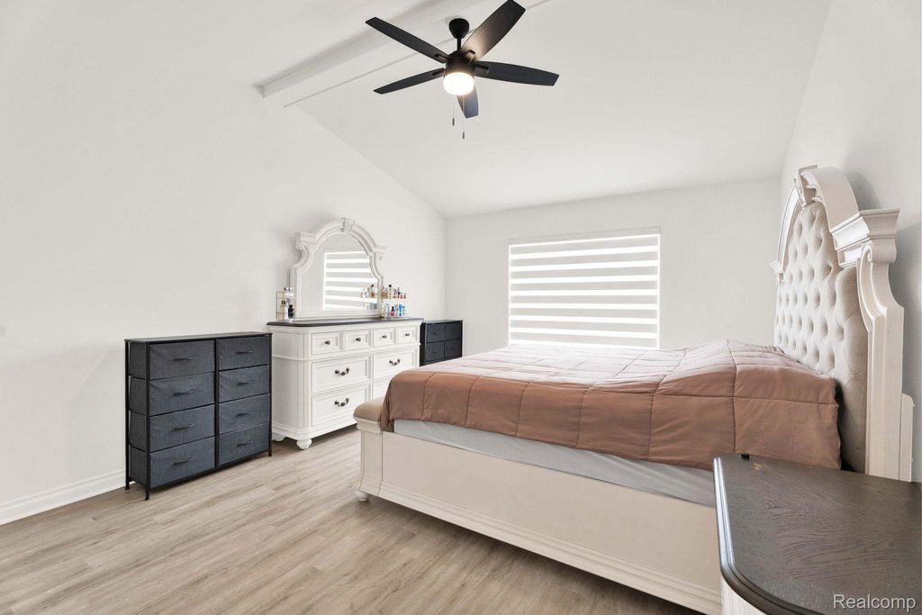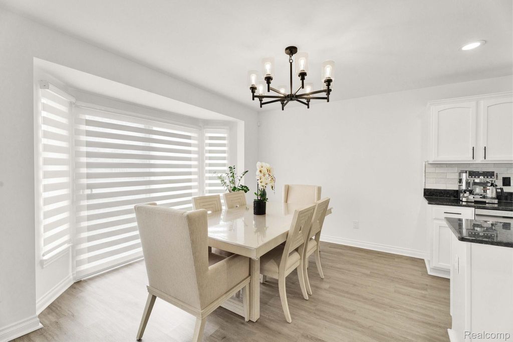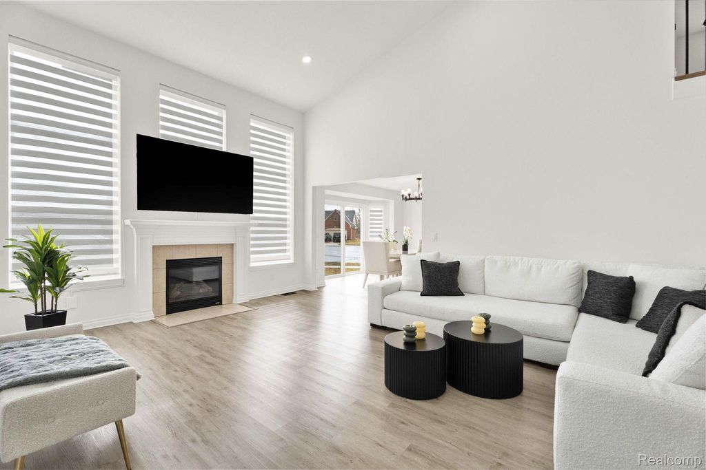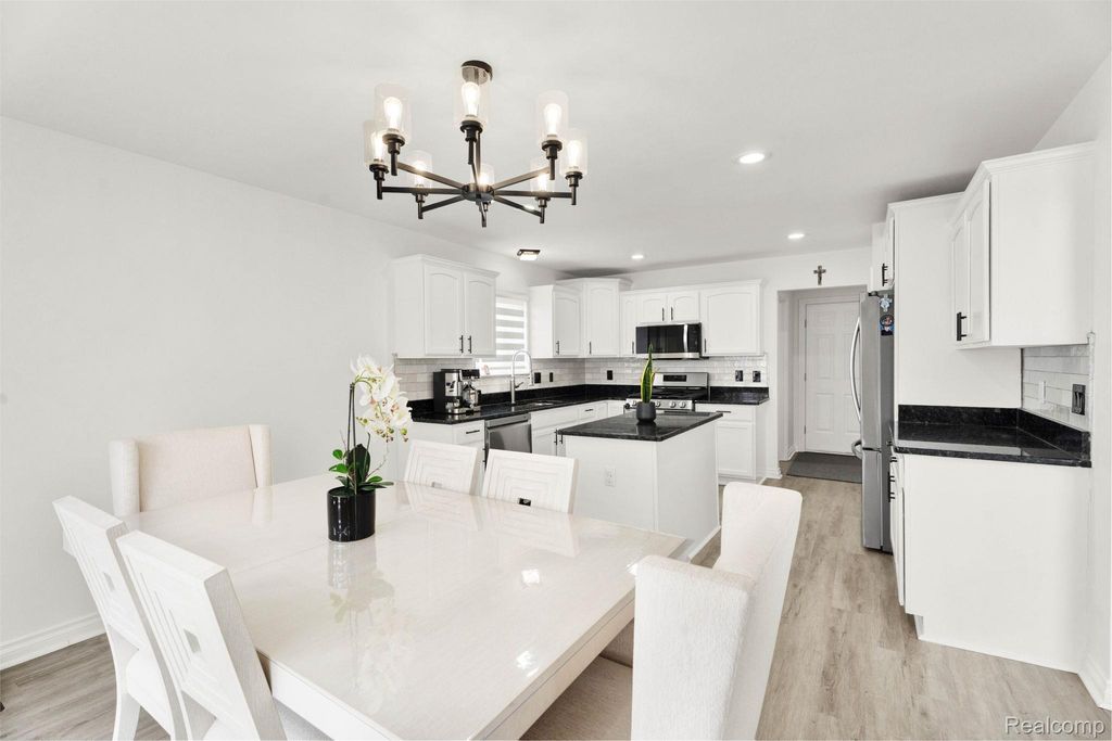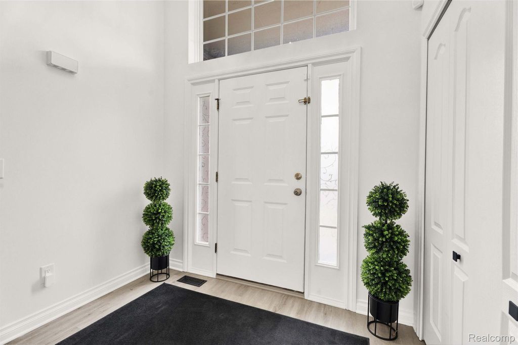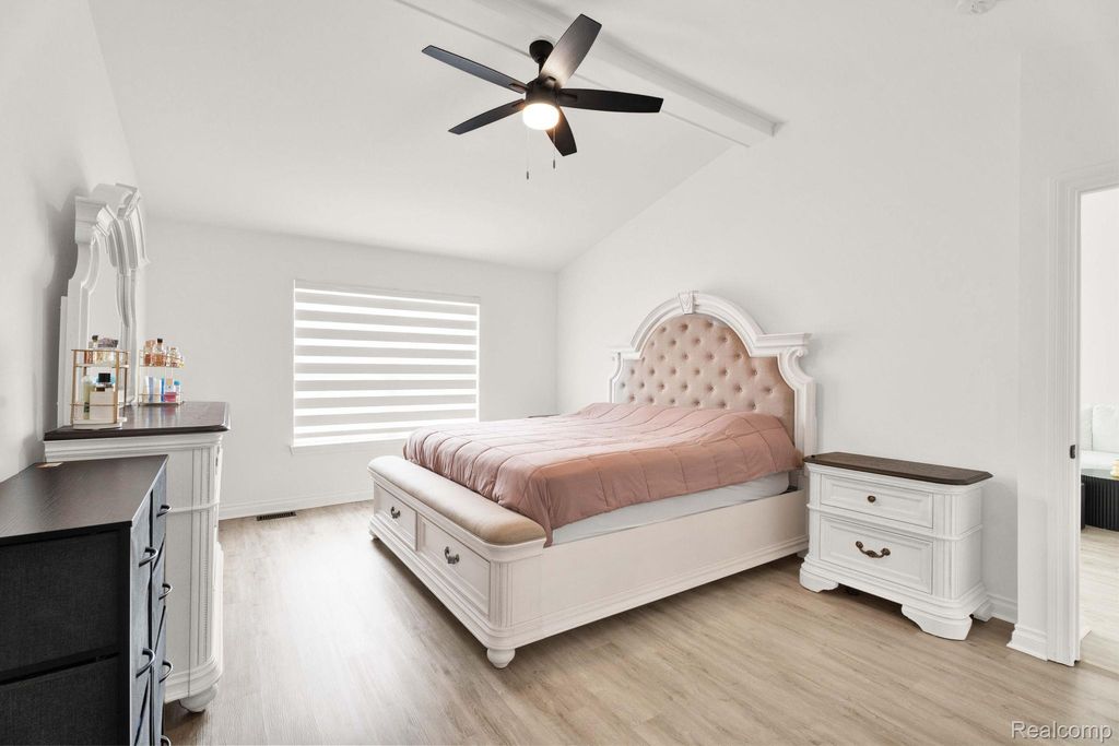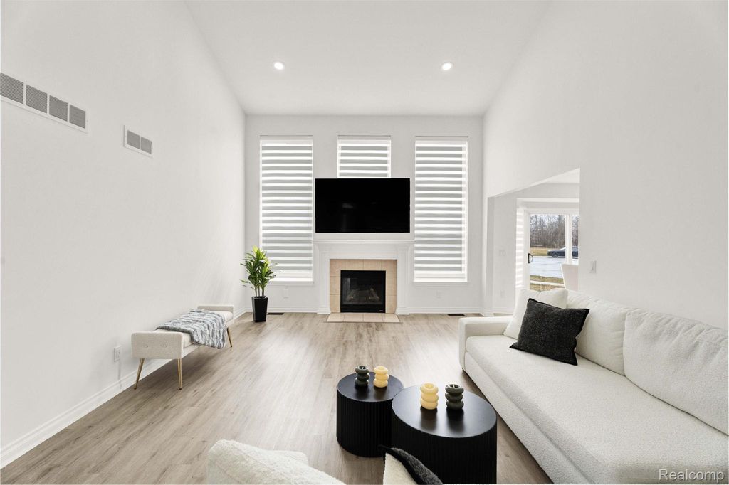 Stunning updated split-level home offering 4 bedrooms, including a first-floor primary suite, and an open floor plan. A welcoming entry leads directly into a large great/family room with vaulted ceilings, an upper-level overlook, and abundant natural light, showcasing a beautiful staircase with hardwood steps.